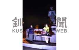 [写真/?木像前でライトアップの点灯を担当した原田さん(左)と幣舞さん ]