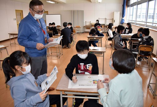 [写真/粥川さん(左から2人目)と話をしながら行動宣言を作成する児童たち ]