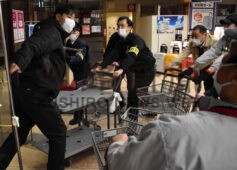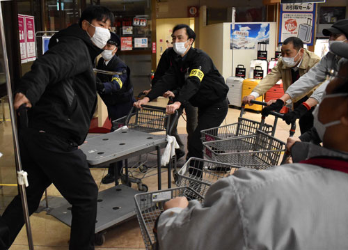 [写真/刺股やカートで不審者をけん制する従業員ら ]