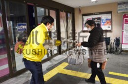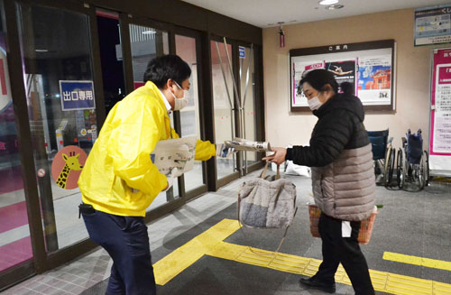 [写真/イオン釧路店で本社社員(左)から号外を受け取る来店客(15日午後7時ごろ) ]