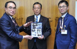 [写真/佐藤局長(左)からフレーム切手を受け取る佐藤町長(中央) ]