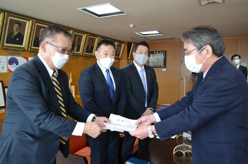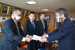 [写真/蝦名市長に目録を手渡す鷲平常務取締役(左) ]