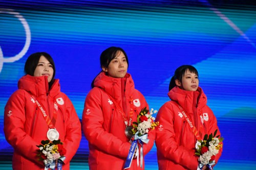 [写真/女子団体追い抜きのメダルセレモニーに臨んだ佐藤選手(左)。マススタートで世界一を目指す ]