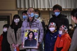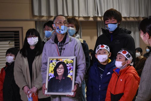 [写真/レース直前、テレビ中継で妻俊恵さんの遺影を持ちインタビューに応じる森重選手の父誠さん(前列左から2人目)=上風連地域センター ]
