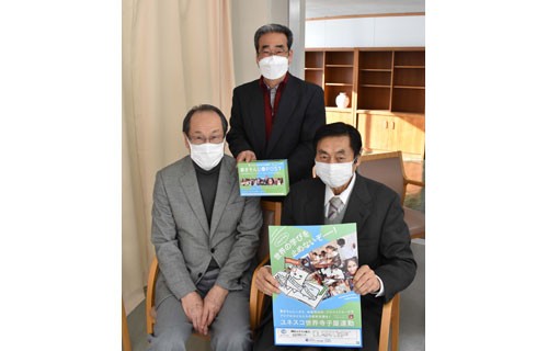 [写真/世界寺子屋運動をPRする(前列左から)戸松事務局長、戸田芳美副会長と平川英治理事(後列) ]