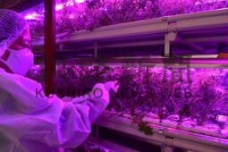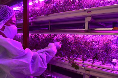 [写真/㊤出荷時期を迎えたCEFのLED野菜「からし水菜」。間もなく店頭に並ぶ㊦販売製品 ]