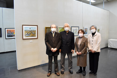 [写真/交流展示発表会をPRする貝塚委員長(左)と関係者 ]