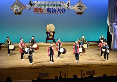 [写真/「みなひとあそびて」を演奏する釧路太平洋太鼓保存会とくしろ蝦夷太鼓保存会 ]