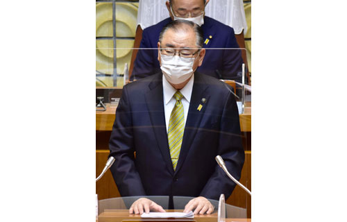 [写真/「コロナ対策と経緯財活動の再開」が優先課題と市政方針を示す石垣市長 ]