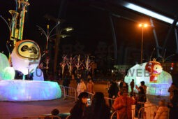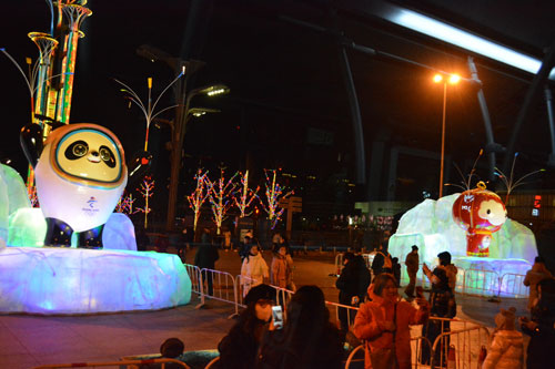 [写真/オリンピック公園入り口で客を歓迎するビンドゥンドゥンとシュエロンロンの巨大電飾 ]