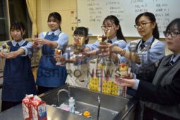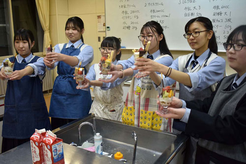 [写真/牛乳をたっぷり使ったパフェを披露する生徒 ]