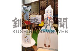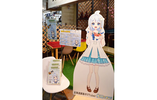 [写真/和商市場内に設けられた鬼霧さんの特設コーナー。等身大パネルとPRチラシが設置されている ]