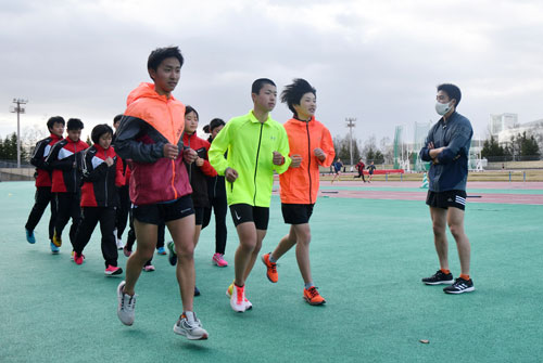 [写真/釧路陸協のトレーニング講習会では、助言をする指導者はマスク着用 ]