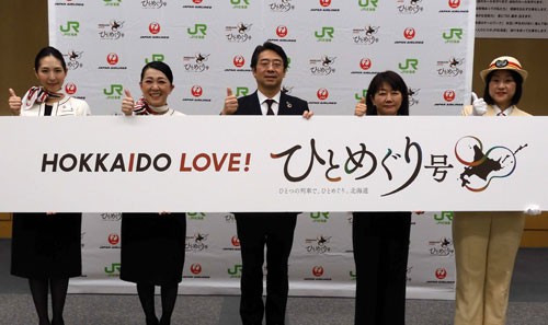 [写真/道東周遊ツアーをPRするJALの林支社長(中央)とJRの林部長(右から2人目)ら ]
