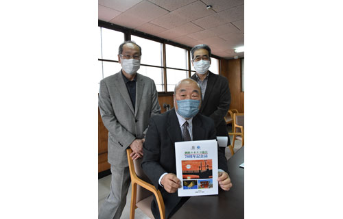 [写真/記念誌を手にする神田会長と役員ら ]