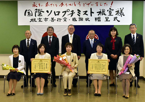 [写真/43年間の活動を終えた国際ソロプチミスト根室のメンバー(前列) ]