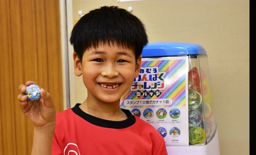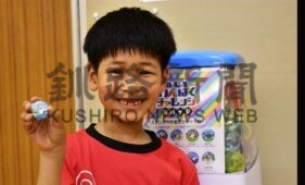 [写真/リニューアル第1号となり「ねむろガチャ」で缶バッジを手にする斉藤君 ]