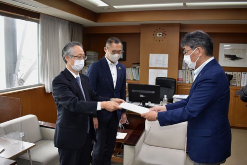 [写真/岡部教育長(右)に報告書を手渡す松本氏、高田専務理事(左から) ]