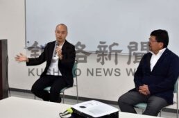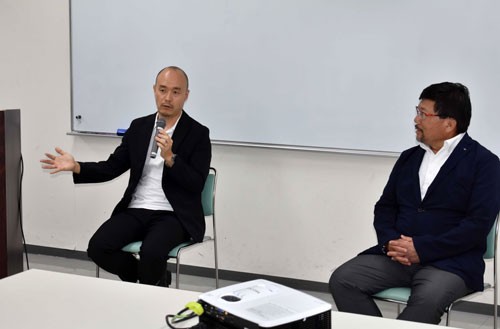 [写真/講演終了後に宮田会長とトークセッションを行う吉田氏(左) ]