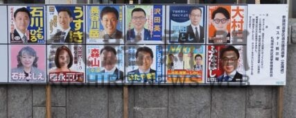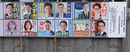 [写真/立候補した12人のポスターが貼られている道選挙区の掲示板 ]