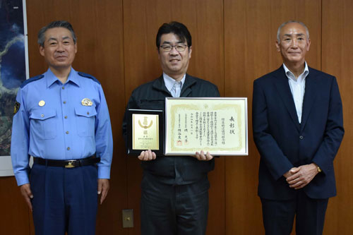 [写真/表彰状などを手に岡村代表(中央) ]