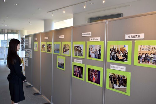 [写真/色丹島訪問の様子を写真パネルで紹介している ]
