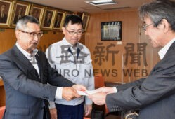 [写真/蝦名市長(右)に目録を手渡す(左から)杉本社長と中西事業部長 ]