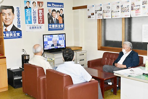 [写真/逢坂誠二代表代行のコメントに耳を傾ける関係者ら(10日午後8時40分ごろ) ]