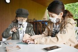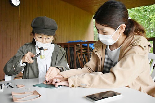[写真/金づちとポンチで牛革に糸を通す穴を開ける親子 ]