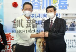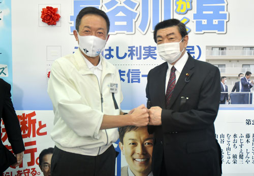 [写真/3期目の当選確実を決め、伊東良孝自民党道連会長(右)と笑顔でグータッチを交わす長谷川岳氏(10日午後8時30分ごろ、札幌市内の選対事務所) ]