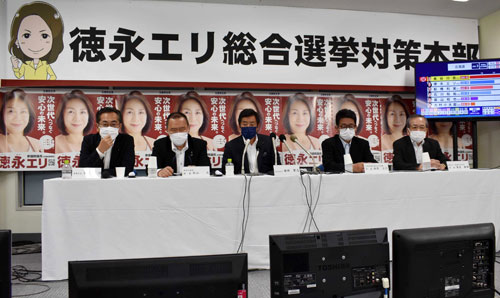 [写真/徳永氏の勝利を信じ、テレビなどで開票の行方を見守る勝部選対委員長(中央)ら(10日午後8時40分ごろ、札幌市内の選対事務所) ]
