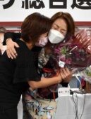 [写真/選対スタッフ(左)から花束をもらって抱き合い、当選の喜びを分かち合う徳永エリ氏(11日午前1時20分ごろ、札幌市内の選対事務所) ]