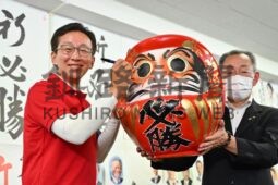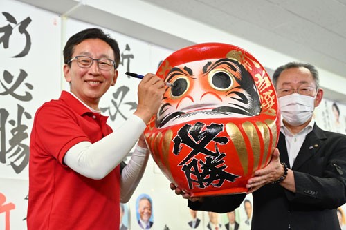 [写真/だるまに勝利の目を入れる船橋利実候補(11日午前2時13分、札幌市内の選対事務所) ]