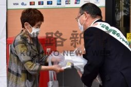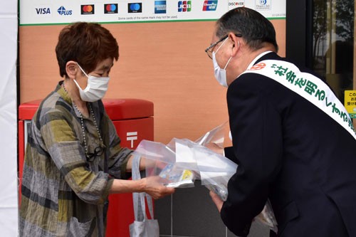 [写真/買い物客に啓発資材を配る石垣市長(右) ]