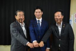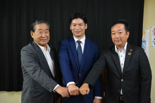 [写真/釧路厚生社IHCの日本一奪還に向けて闘志を燃やす中山会長、上野選手、福田社長(左から) ]