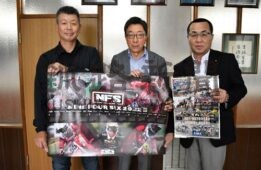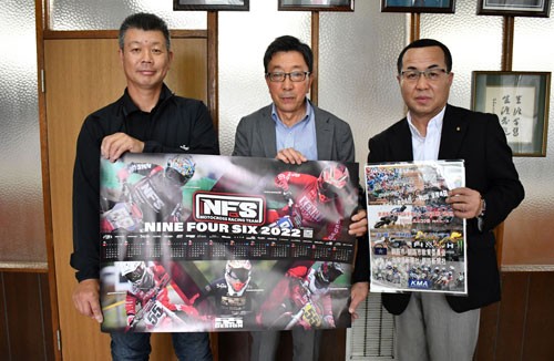 [写真/ポスターを手に来場を呼び掛ける酒巻勝美大会長、石田会長、桒垣光秀事務局長(右から) ]