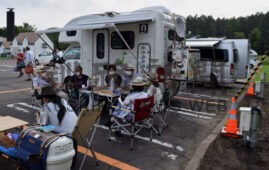 [写真/外にテーブルを出して談笑するRVパークの利用者 ]