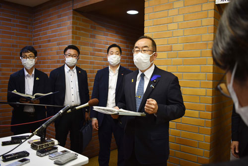 [写真/2日間にわたる根室管内での意見交換を終え報道陣の質問に答える西銘担当相(右)(14日午後、中標津町役場) ]