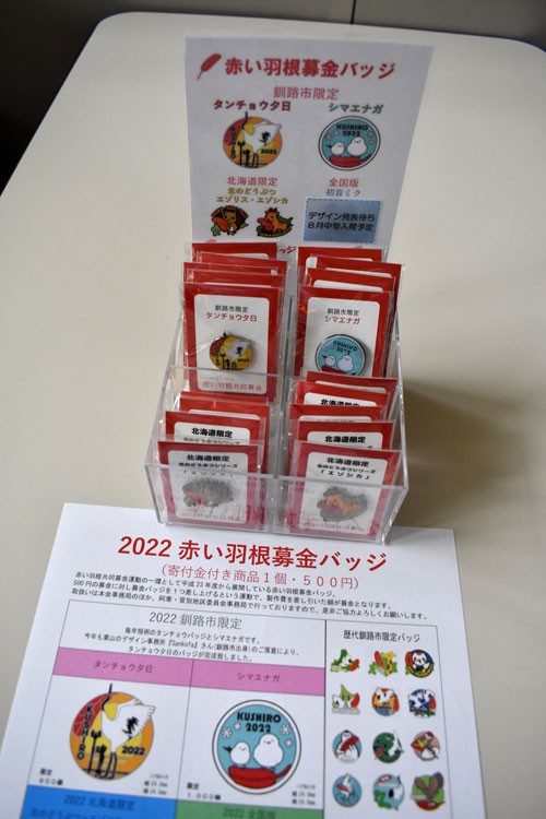 [写真/タンチョウとシマエナガをデザイン化した赤い羽根募金バッジ ]