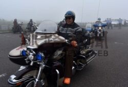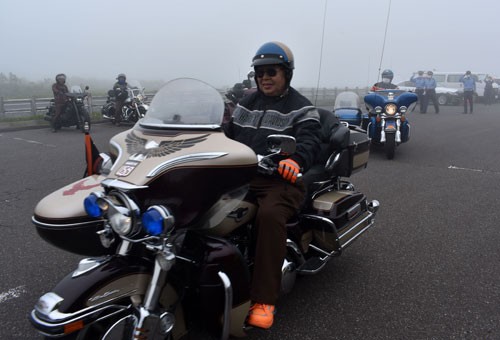 [写真/あいにくの濃霧の中、啓発するハーレー警ら隊員 ]