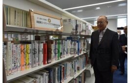 [写真/寄贈したビジネス書を見詰める猿子前会長 ]