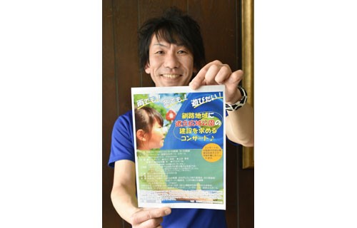 [写真/チラシを手に「歌を通して誘致活動を盛り上げたい」と伊藤さん ]