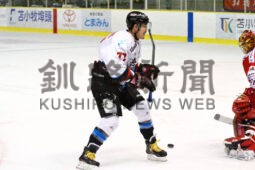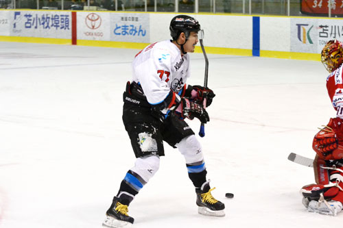 [写真/【プレーオフファイナル、王子━日本製紙】第3ピリオド14分、ペナルティーショットをはずし、顔をしかめるDF梁取(左) ]