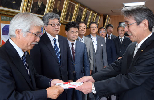 [写真/蝦名市長に目録を手渡す長谷川会長(左) ]