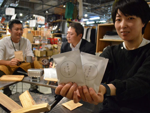 [写真/イーハブ店内で0.5合パックのセレクト米をPRする舟木さん(右) ]