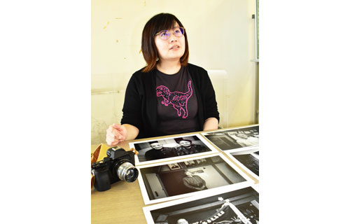 [写真/元島民のモノクロ写真とウクライナ製レンズを付けたカメラを前に山田さん ]
