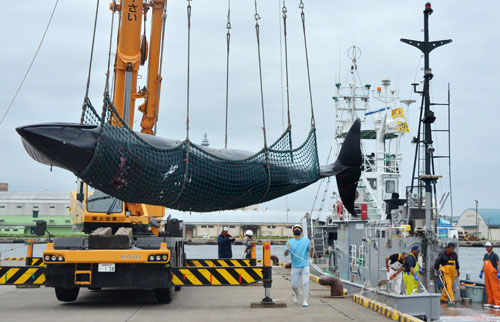 [写真/水揚げされた1頭目のミンククジラ(22日午後3時30分ごろ、釧路港北埠頭) ]