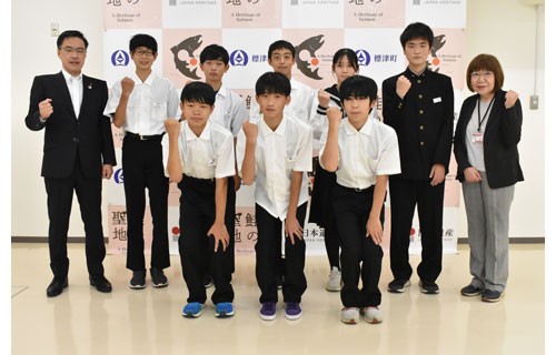 [写真/星副町長(右)らに活躍を誓った選手 ]