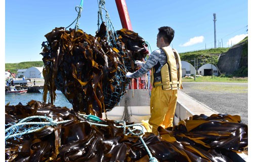 [写真/歯舞地区のナガコンブ漁の水揚げ(25日午前9時すぎ、友知漁港) ]