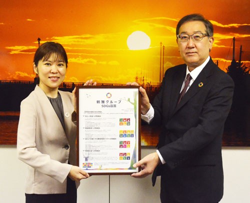 [写真/SDGs宣言した鶴雅ホールディングスの大西副社長(左)と織田支店長 ]